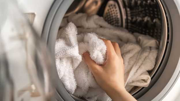 Wymieszaj 2 składniki i wrzuć do bębna z pożółkłymi ręcznikami. Po praniu będą białe jak po wybielaczu