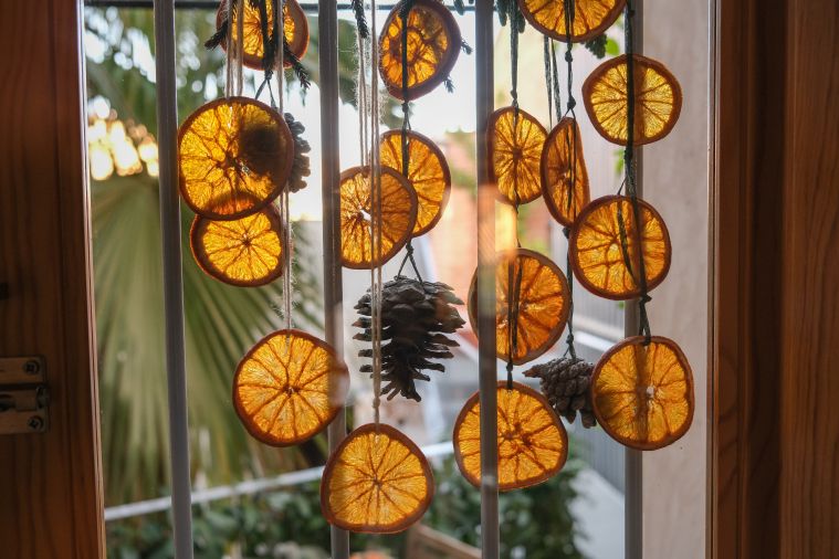 Suszone pomarańcze sprawdzą się nie tylko w salonie. Na balkonie lub tarasie możesz stworzyć z nich nastrojowe girlandy, które ładnie wyglądają w połączeniu z szyszkami, gałązkami świerku lub eukaliptusa. Zawieś je na poręczy lub nad drzwiami balkonowymi, a będą pięknie pachnieć. Do tego nadadzą miejscu przytulny, rustykalny klimat.