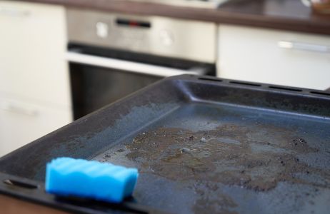 Usmoloną blachę namaczam w domowej miksturze z 2 składników. Brud odchodzi płatami bez szorowania